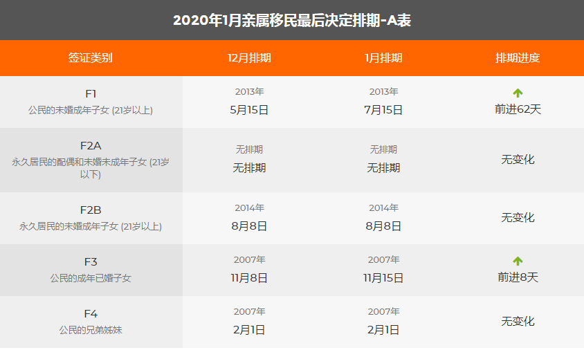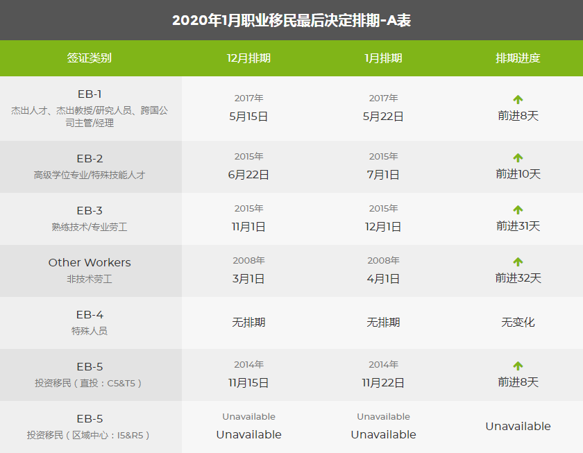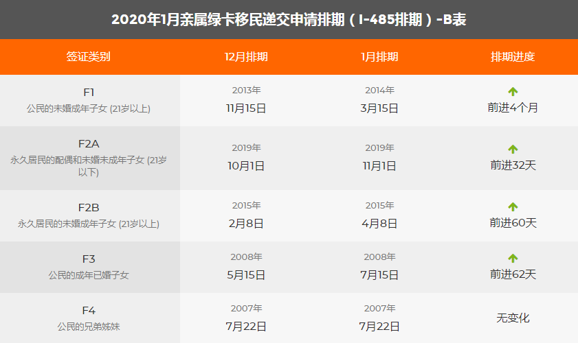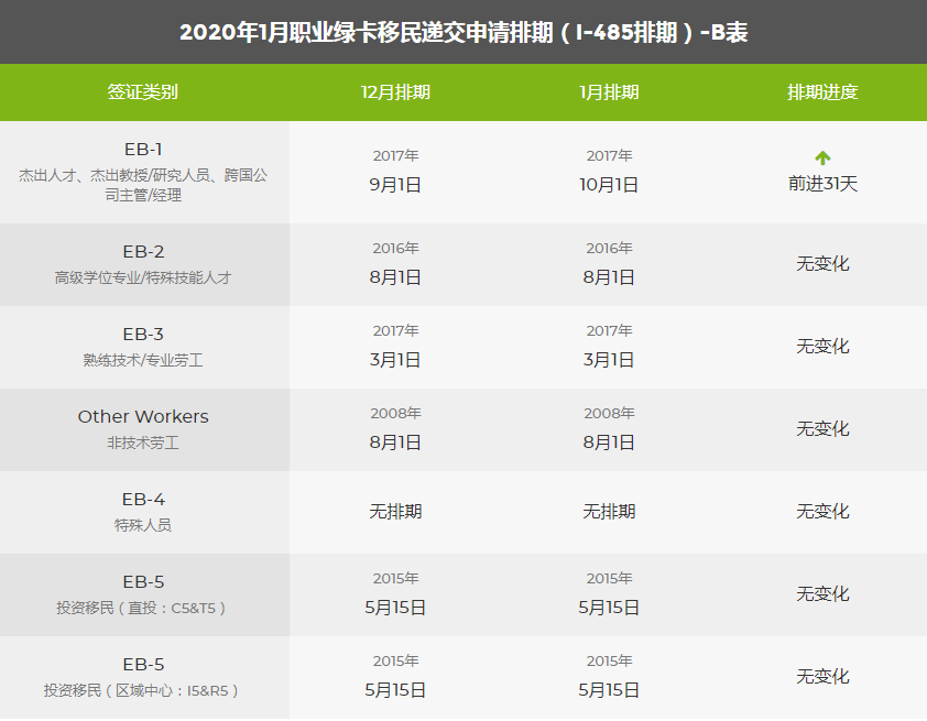 2020年1月美國(guó)移民綠卡排期表