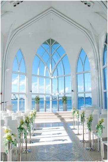 水晶教堂坐落在杜夢灣北部,向南可以眺望真個杜夢灣全景,向北可以仰望戀人岬,悠悠的海風吹佛來清新,美好,浪漫的氣息,不正好符合戀人們來這里的心態嘛。水晶教堂建于2004年,可謂是馳名國內外。當時剛剛建成時,更是有戀人們迫不及待的在這里舉辦了婚禮,看重的就是這里干凈,通透的教堂風格。教堂的外觀采用哥特式建筑風格,陽光通過透明的藍色彩繪玻璃照進以白色為基調的教堂,藍白互相輝映,風景無限好。教堂內的設備也大多是白色的:白色的鋼琴,白色的木質賓客椅,透明的玻璃儀式臺,在襯托美麗的鮮花,透過玻璃是美麗的大海,用一切的美好來見證,世間最美好的事---愛情。水晶教堂處在日航酒店內,而且是以婚禮村作為設計理念,為所到的新人提供貼心的服務,包括美容院,化妝間。接待室更有三種風格,包括“巴厘花園”,“美國海”,“法國海灣”。