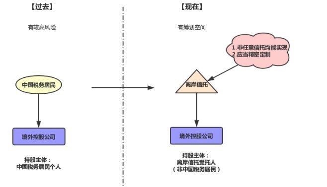 (1)將資產由個人(中國稅務居民)持有轉為由離岸信托(非中國稅務居民)持有:若相關人士將由自己直接持有的股權裝入信托,此時離岸信托作為資產的所有權主體,境外收益的分紅主體完成了由中國稅務居民到非中國稅務居民的轉變,在現行稅法下,利潤分配至信托項下境外控股公司暫不需要繳納中國個人所得稅。