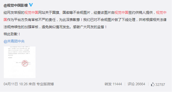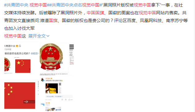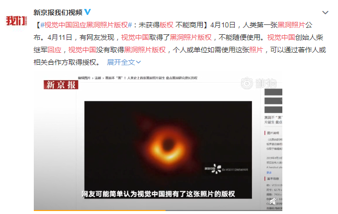 4月10日,人類第一張黑洞照片公布,但在4月11日就有人發現視覺中國取得黑洞照片的版權,不能隨意使用。“黑洞照片”的圖源——歐洲南方天文臺(ESO)官網,聲明該圖片支持共享和再創作等演繹,無需支付費用。這還沒有結束,視覺中國竟然被共青團中央點名,國旗、國徽的版權也是貴公司的?