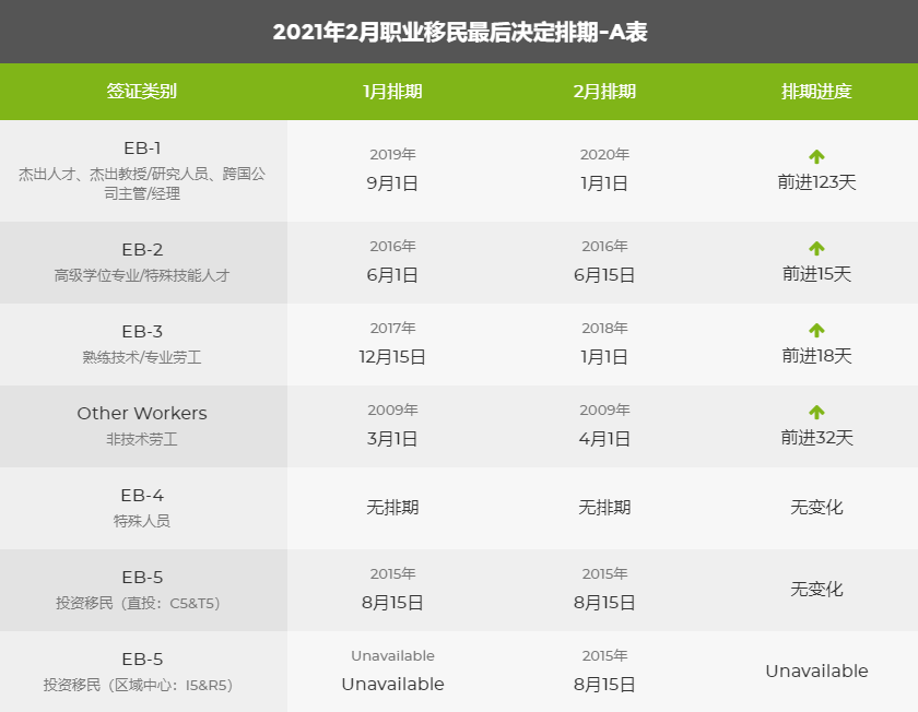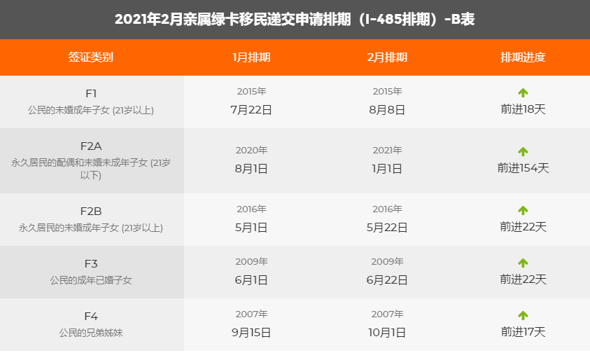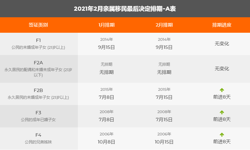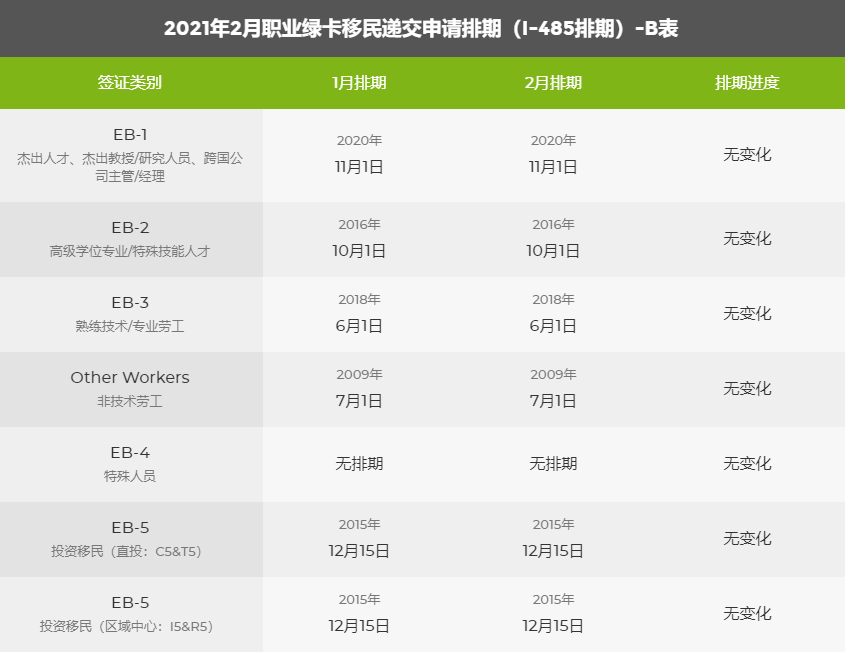 最新消息:國務院公布的2021年2月綠卡移民排期公布,親屬移民基本停滯,職業移民各種類型均有前進。