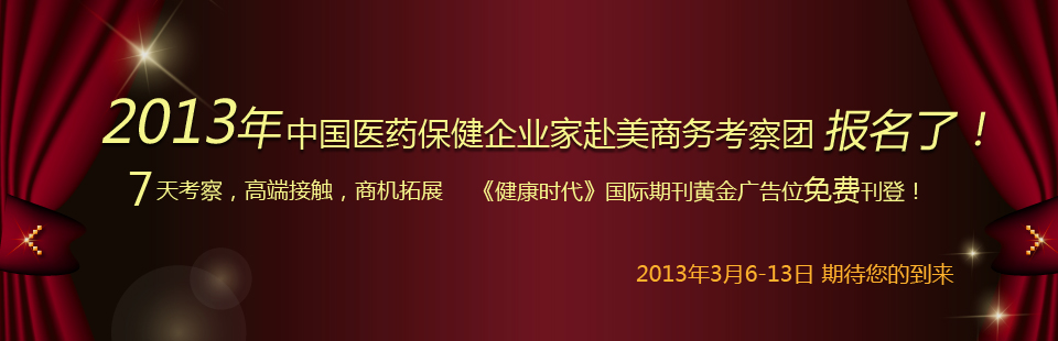 敬請對此感興趣的各界同仁及朋友盡快與我們聯系,如欲前往,報名從速!所有報名參加本團者,《HEALTH TIMES》(健康時代)國際期刊為您贈送免費廣告1/2版位,期待您的參與,并希望與您一同相聚美國,共話保健及醫藥產業的合作與發展!恭祝萬順!