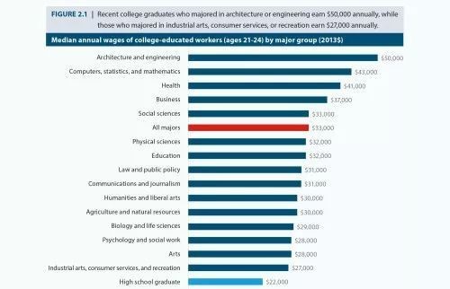 University教育與就業(yè)中心2018年的數(shù)據(jù),可以看出21到24歲畢業(yè)生(基本上就是應(yīng)屆畢業(yè)生)的工資中位數(shù)中,建筑及工程方向的薪資最高($50k),緊接著是計(jì)算機(jī),統(tǒng)計(jì)及數(shù)學(xué)($43k)。商科和醫(yī)學(xué)方向?qū)W科算是非STEM專業(yè)里工資較高的了。